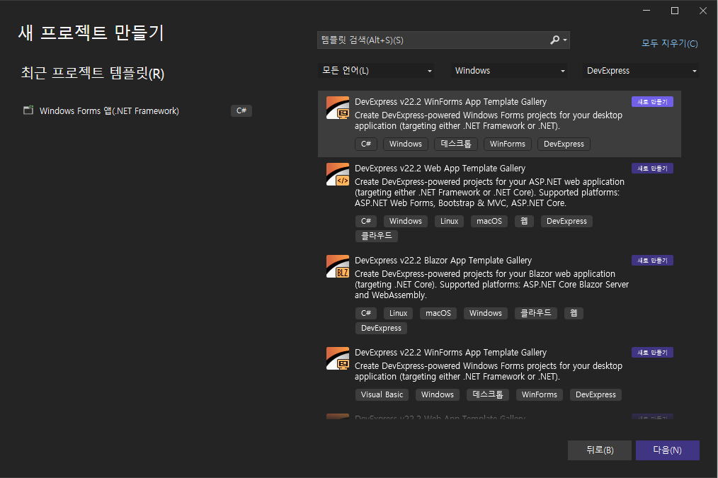 - 프로젝트 시작에서 DevExpress Winforms App Templeate Gallery를 선택 -> 다음