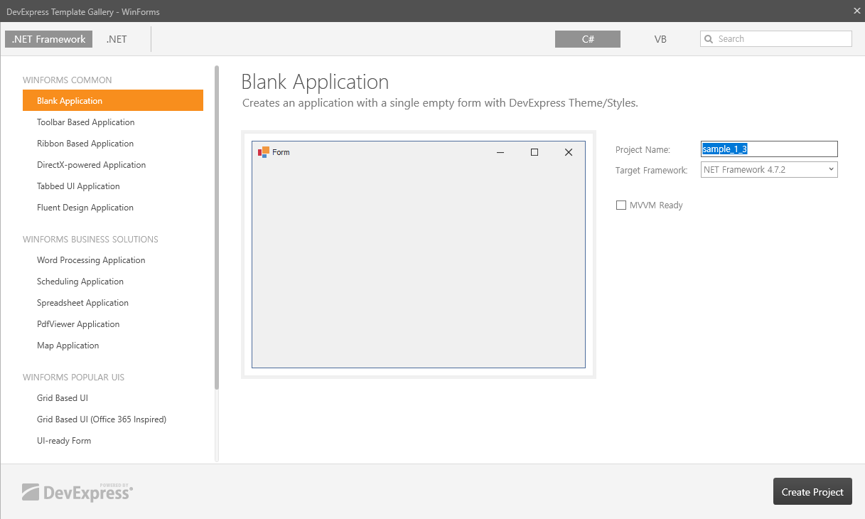 - 윈도우 기본폼을 선택합니다 (Blank Application) -> Create Project