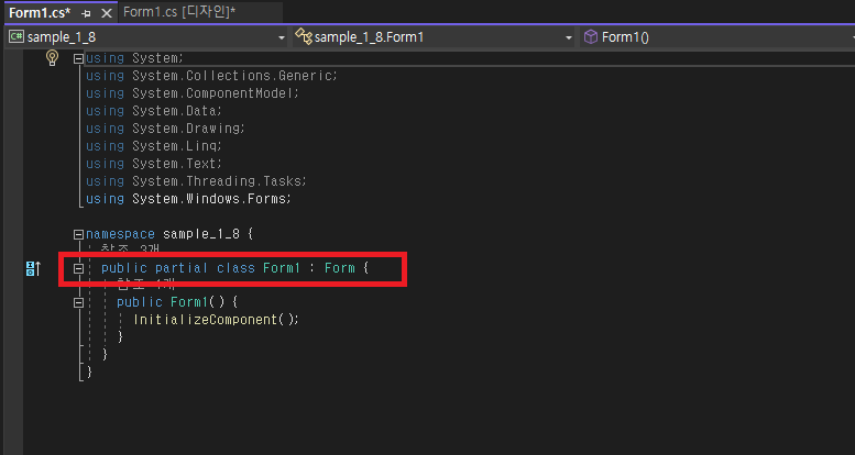 - 소스는 상속은 아직까지 Windows 기본 Form임을 확인할수 있습니다.