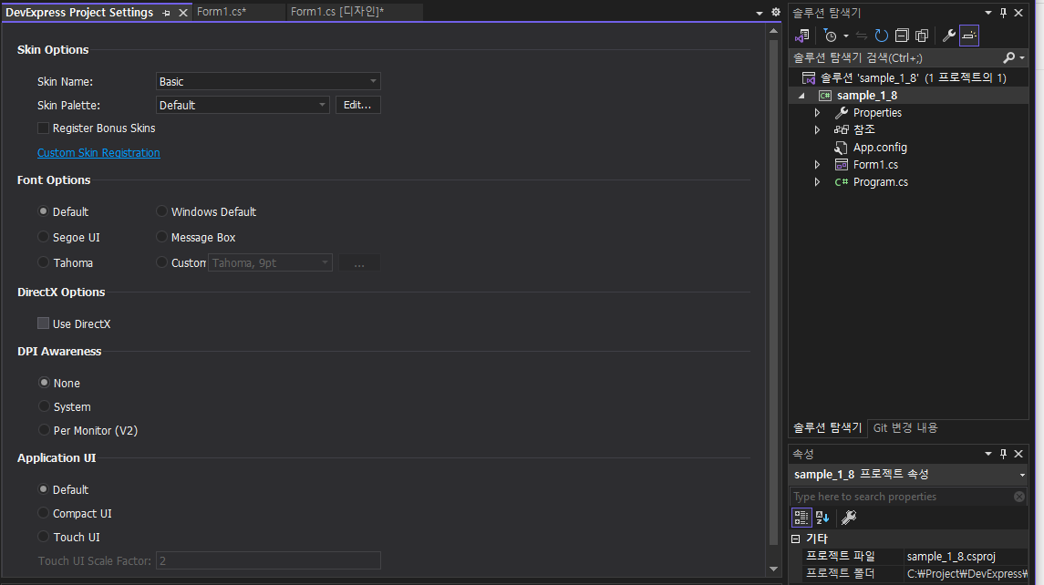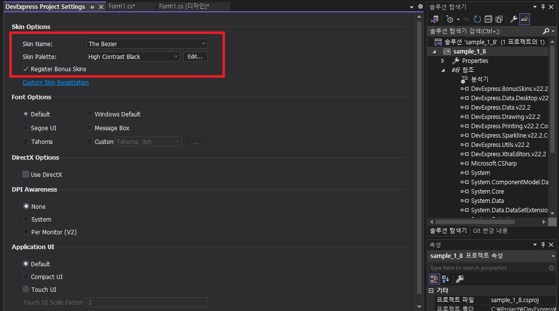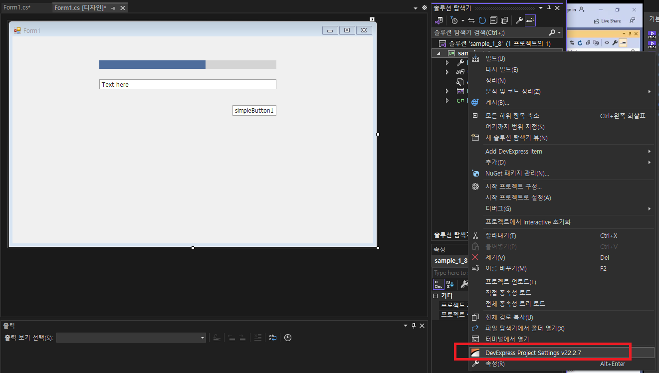 - 프로젝트에서 오른쪽 마우스 -> DevExpress Project Settings 선택