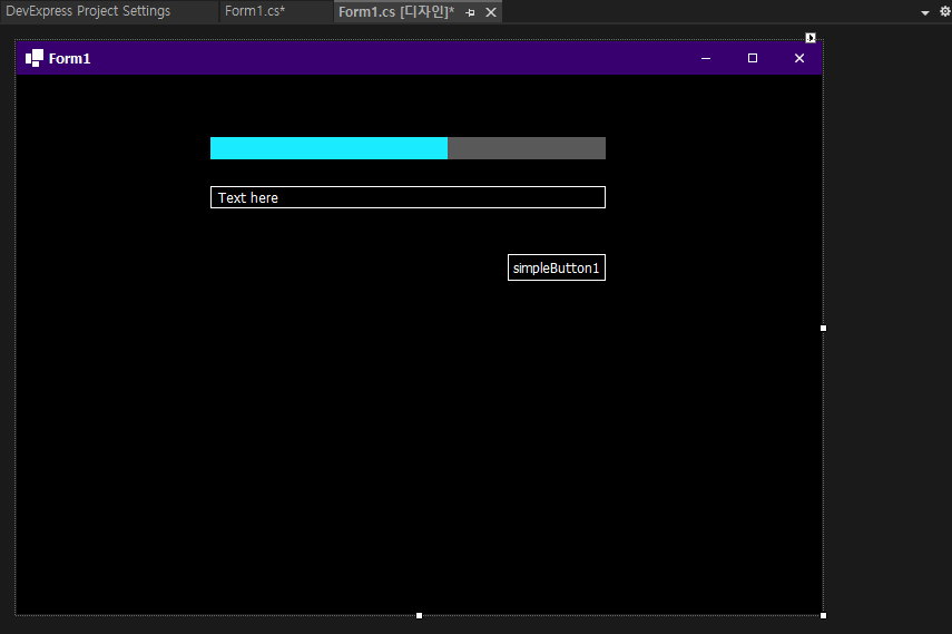 - 화면에는 DevExpress progressBar, textEdit, simpleButton 컴포넌트가 있습니다.