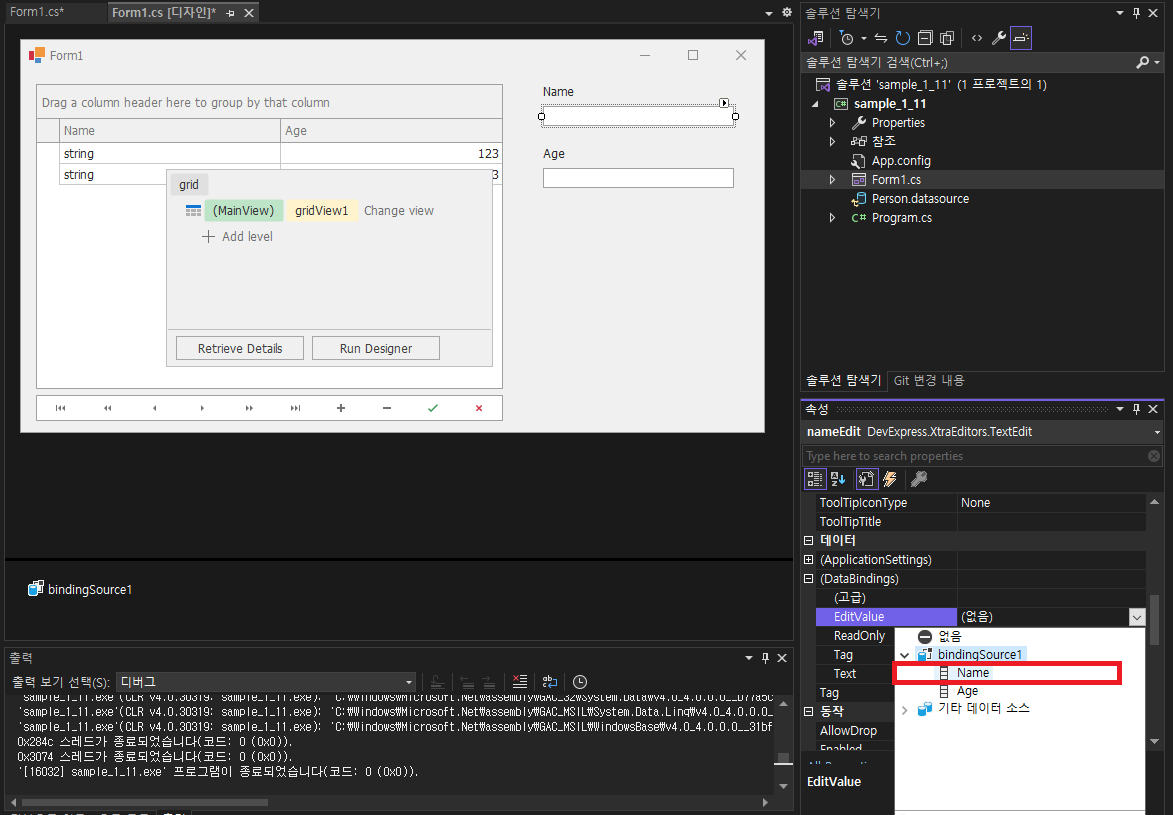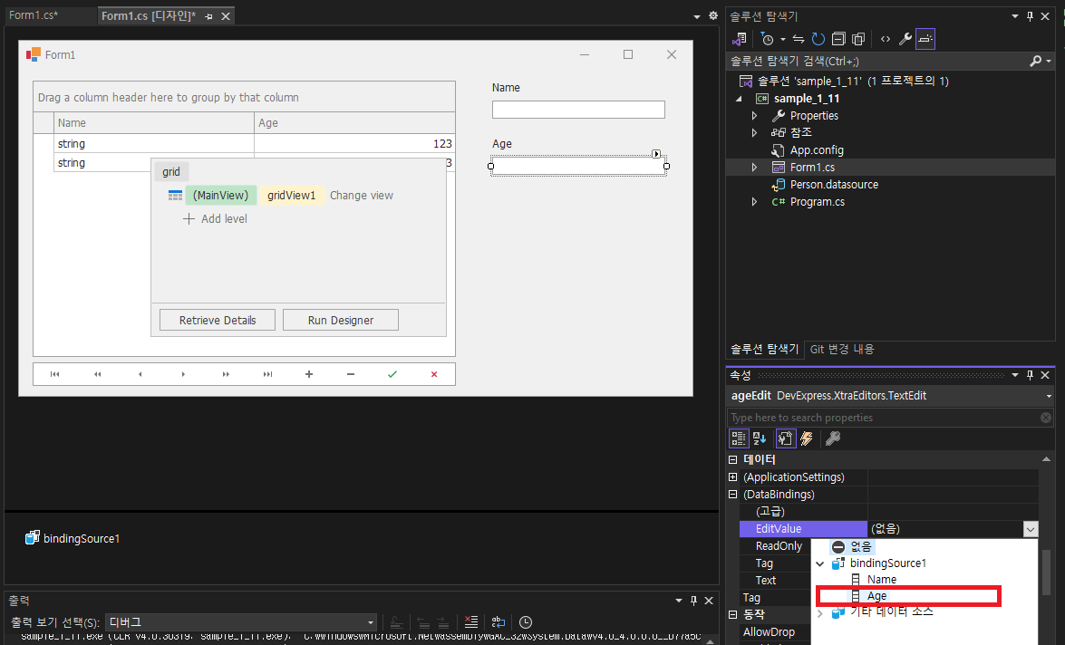 - TextEdit Name(ageEdit)에서 데이터 -> DataBindings -> EditValue 변경 -> bindingSource1 -> Age 선택