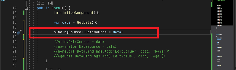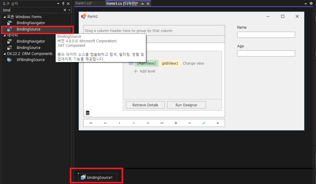 - 아래와 같이 bindingSource1 컴포넌트가 추가되었습니다.