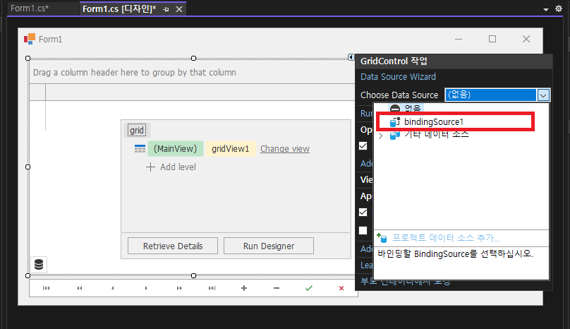 - Data GridControl(grid)에서 DataSource 변경 -> bindingSource1 선택