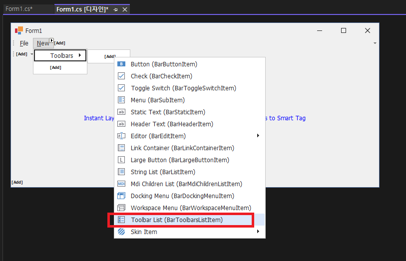 - barManager1 컴포넌트가 추가되면서 화면에 메뉴[Add]라는 부분이 3개가 생성됩니다.