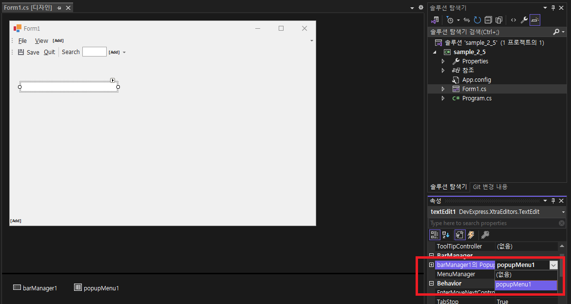 - standaloneBarDockControl1를 Dock 선택후 Bottom 선택
