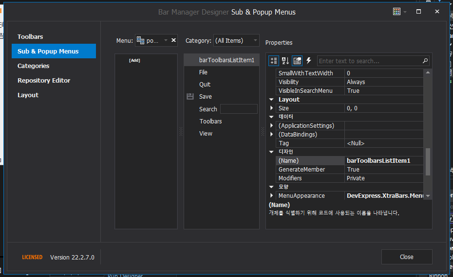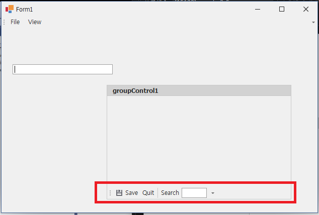 - GroupControl를 먼저 추가하고 StandaloneBarDockControl를 GroupControl 위에 추가 합니다.