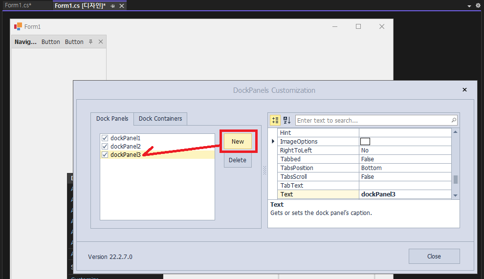 - DockManager를 검색해서 Form1 디자인에 추가 합니다.