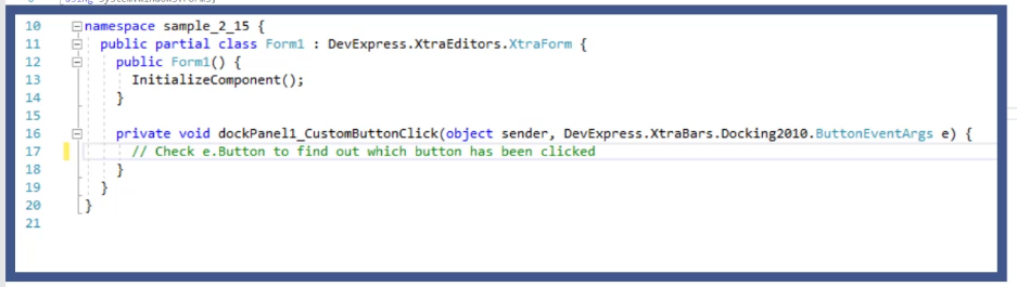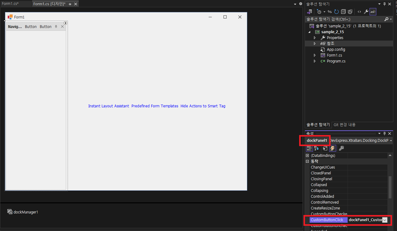 - dockPanel1선택후 CustomButtonClick 더블클릭후 소스를 추가합니다.