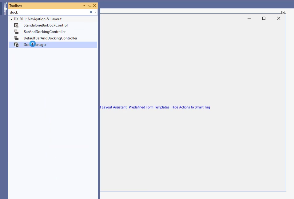 - DockManager를 검색해서 Form1 디자인에 추가 합니다.