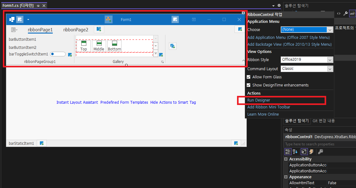 - ribbonGalleryBarItem1에서 GalleryDropDown를 좀전에 만들어 놓은 Item으로 변경합니다.