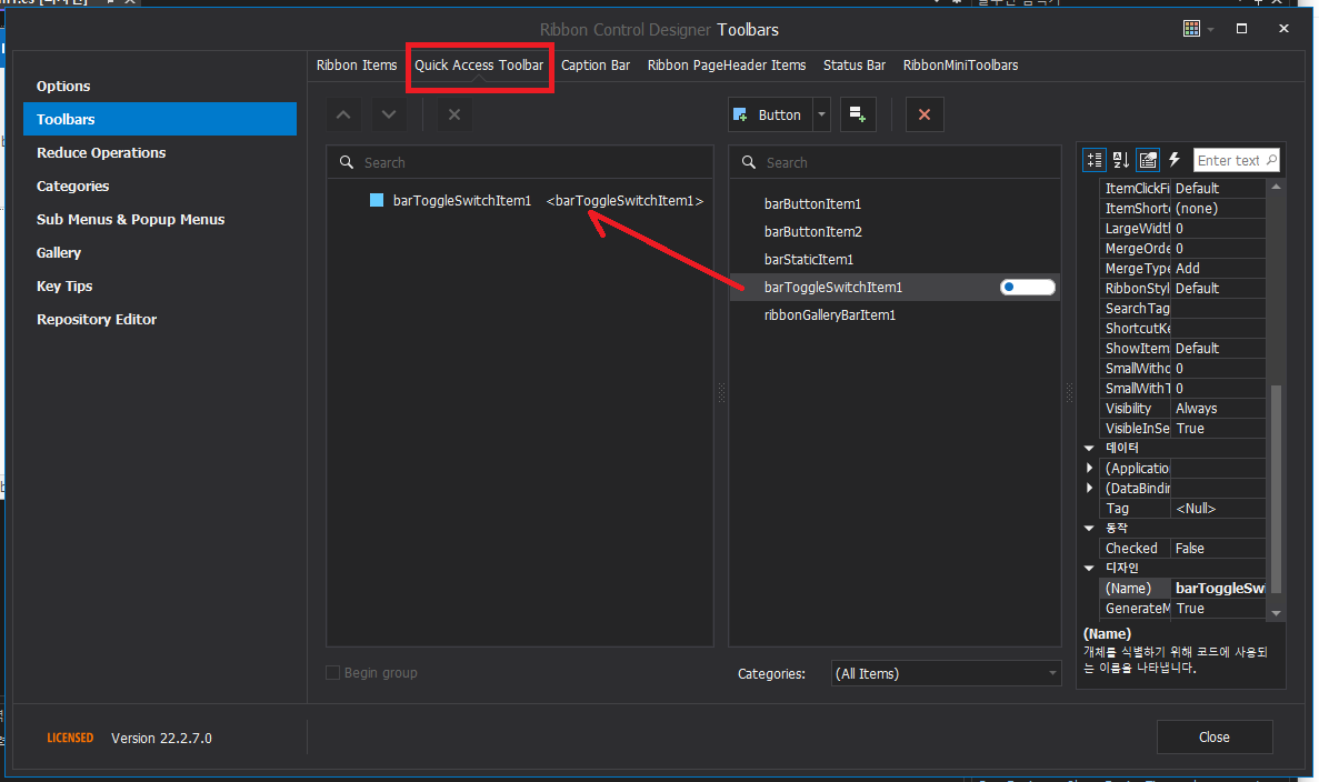 - Quick Access Toobar : 화살표 방향으로 barToggleSwitchItem1를 드레그해서 왼쪽화면으로 끌고와 놓습니다.