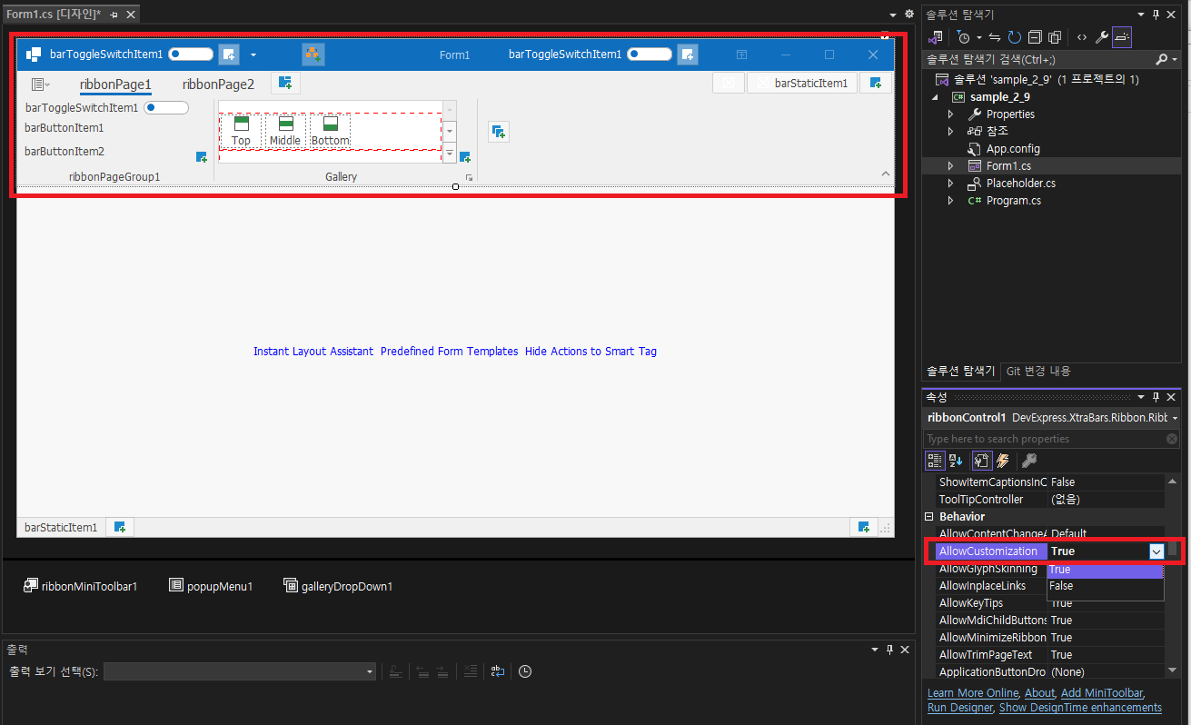 - 메인폼(Form1)에서 ribbonControl1 컴포넌트를 선택합니다.