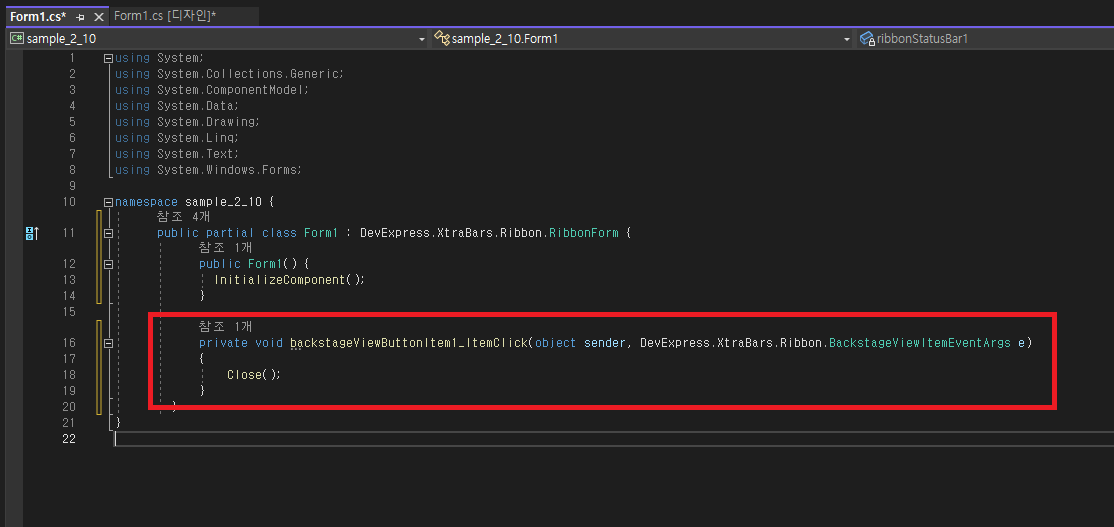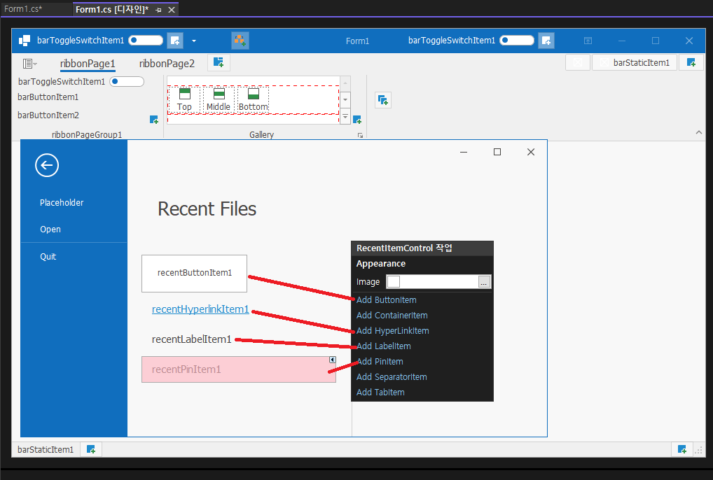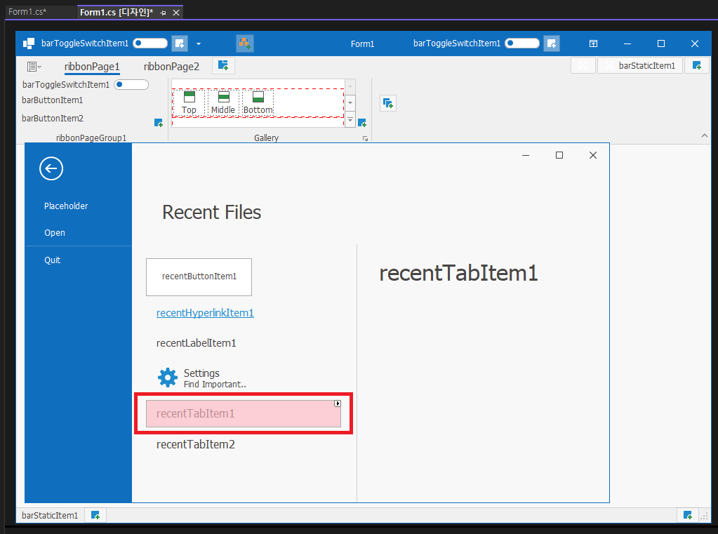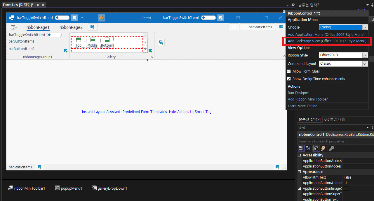 - Ribbon Control (ribbonControl1) -> ApplicationButtonDropDownControl : backstageViewControl1 자동 선택되어 있습니다.