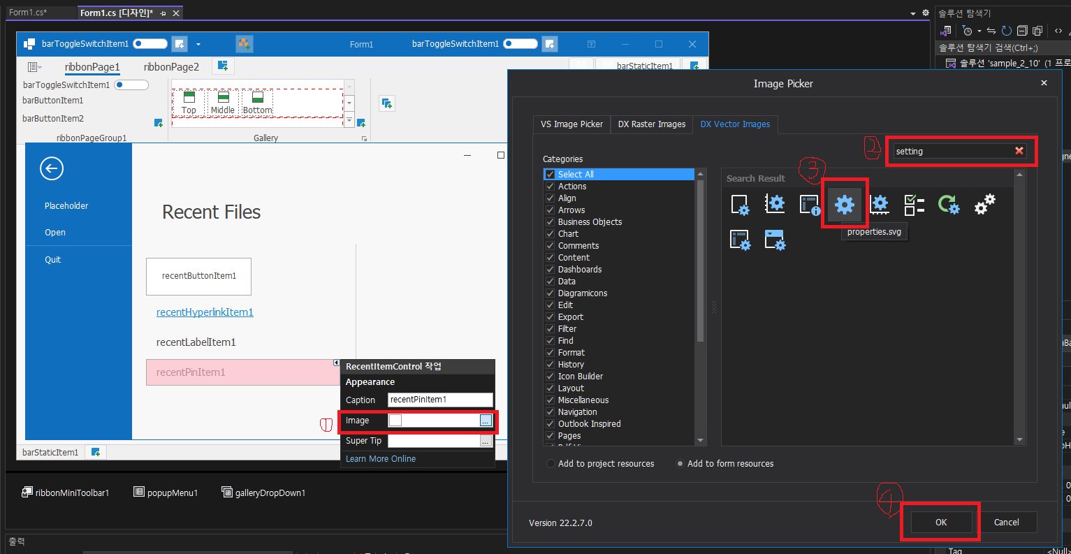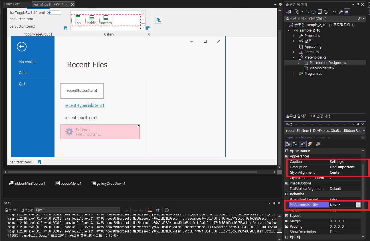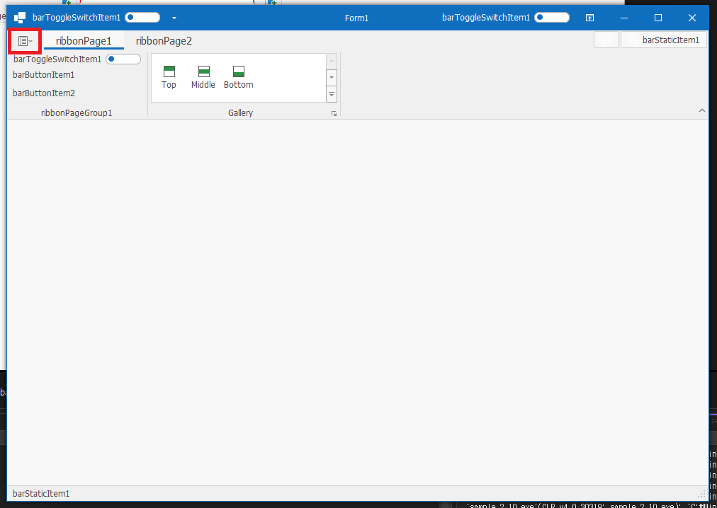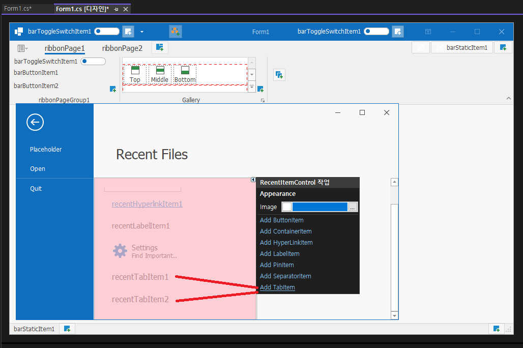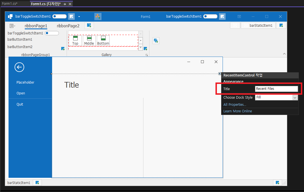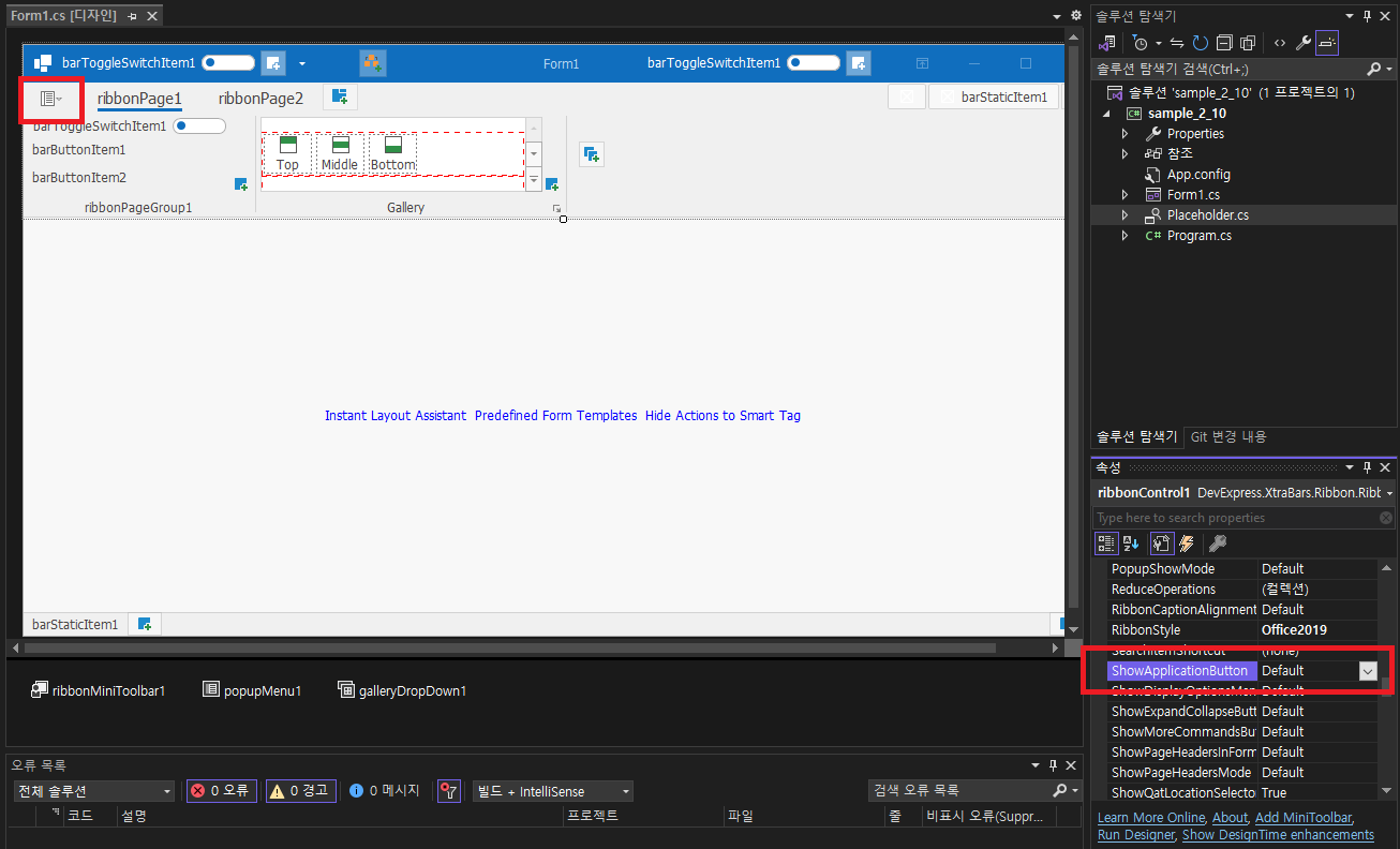 - Ribbon Control (ribbonControl1) -> ApplicationButtonDropDownControl : backstageViewControl1 자동 선택되어 있습니다.