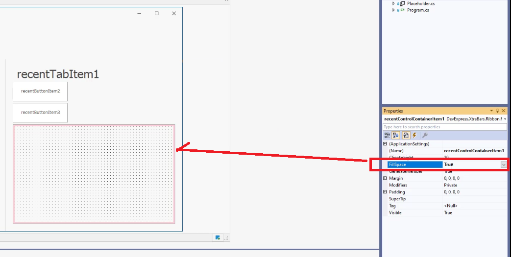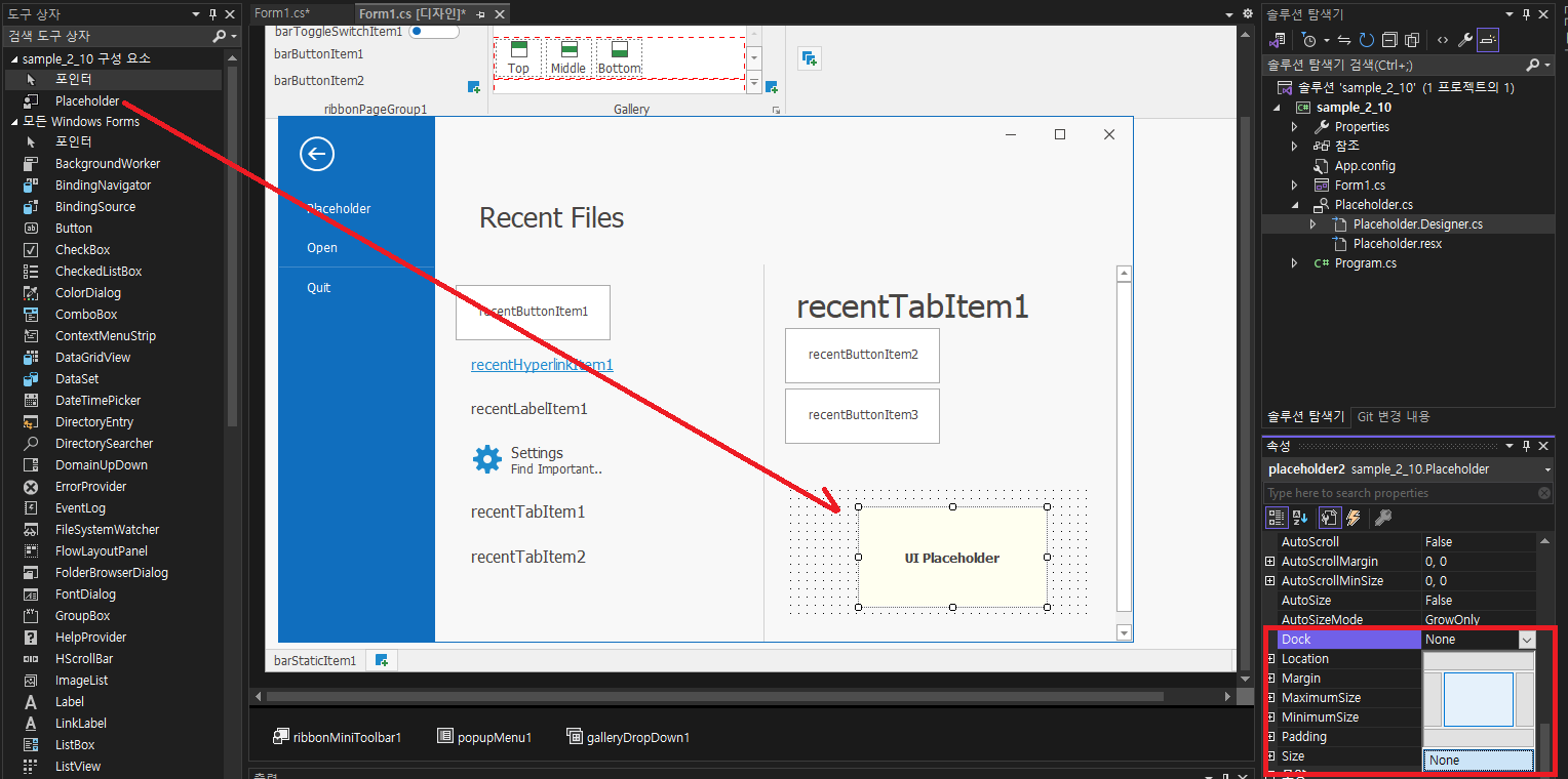 - 그리고, Placeholder 컴포넌트를 추가후 Dock를 Fill 변경