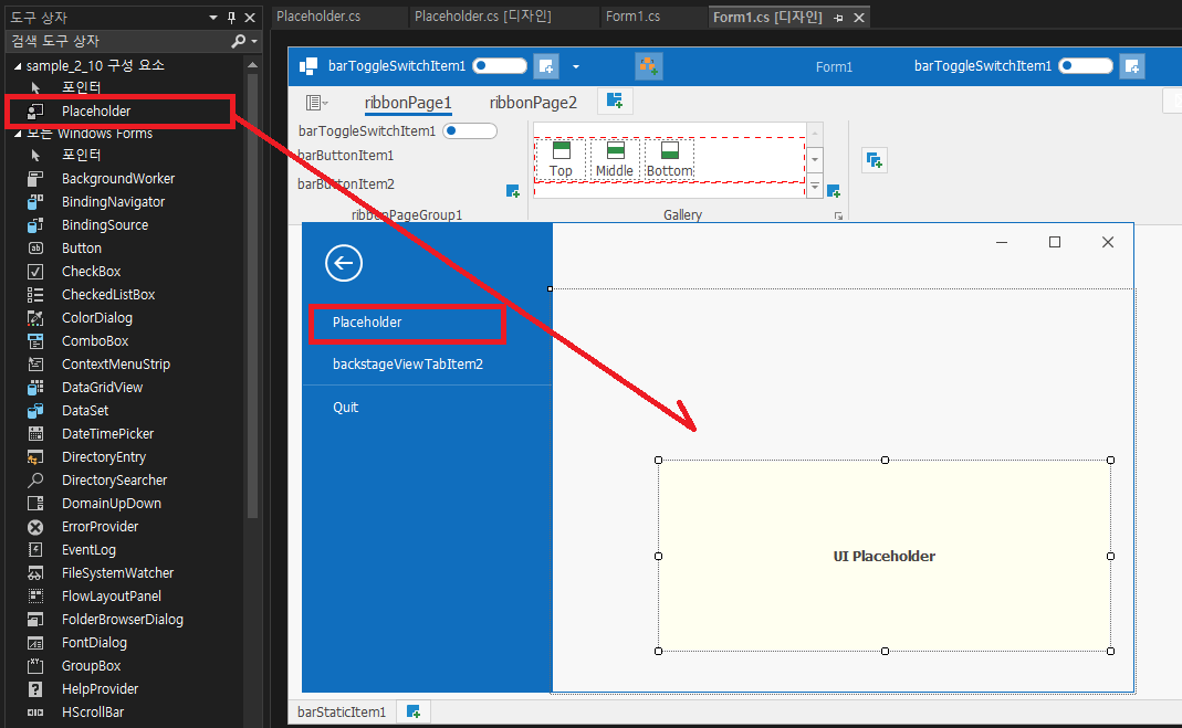 - 첫번째 Item backstageViewClientControl1를 선택, Caption : Placeholder 변경, Placeholder 컴포넌트 추가