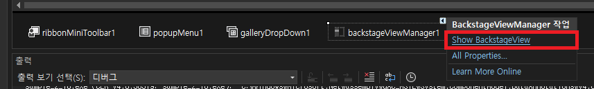 - 위 내용 화면을 다시 보이고자 하실때는 아래 컴포넌트 backstageViewManager1에서 'Show BackstageView'를 선택하면 됩니다.