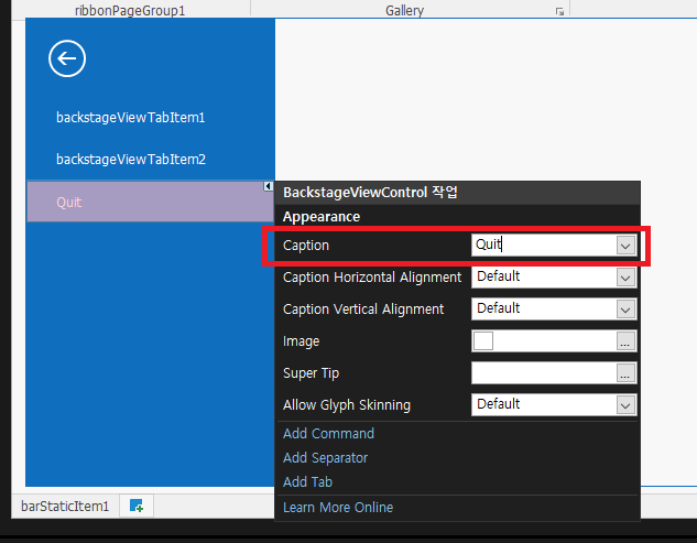 - Add Command 추가시 backstageViewButtonItem1을 선택
