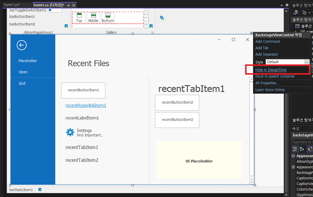 - Application BackstageViewControl를 않보이게 하고자 하실때는 아래와 같이 'Hide in DesignTime'를 선택합니다.