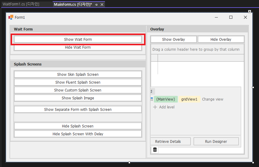 - SplashScreenManager 컴포넌트 추가후 기본으로 제공되는 Wait Form에 대해 진행하겠습니다.