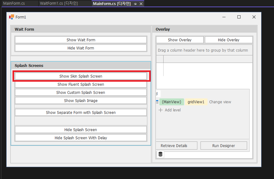 - SeparateForm에서 splashScreenManager1 선택후 SplashScreenManager 작업